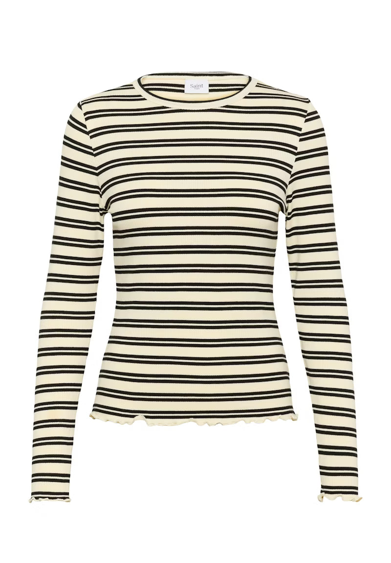 Denne langærmede, ribstrikkede top har en klassisk rund hals og slank pasform for optimal komfort. Bløde flæsekanter giver et stilfuldt touch. Ideel til lag-på-lag eller alene, perfekt til hverdagsbrug.