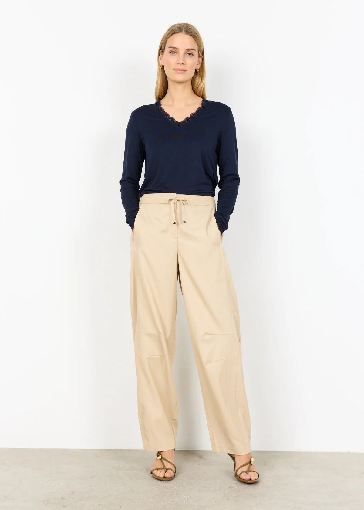 Bukserne har snøre i taljen og elegante syningsdetaljer med et hellangt design.