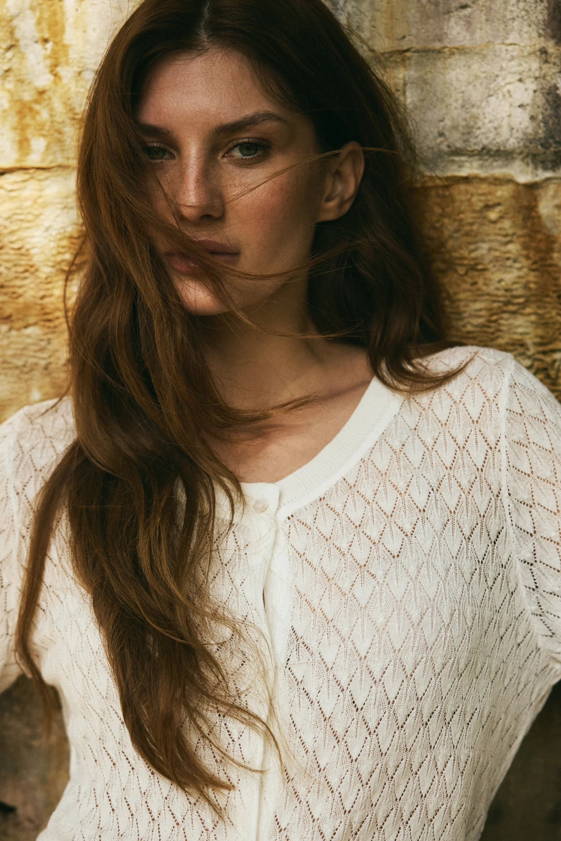 Strikket cardigan med V-hals og gennemgående knaplukning. Fin hulstrikket struktur giver et let og feminint udtryk.