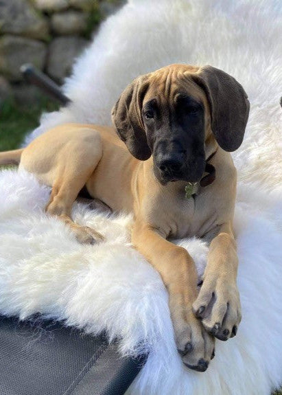Model: Grand Danois hvalp, Freja. Freja bruger sit store skind - specielt i bilens bagrum, hvor hun genkender det dejlige varme bløde underlag. Det er derfor ingen sag at få hende med ud at køre.