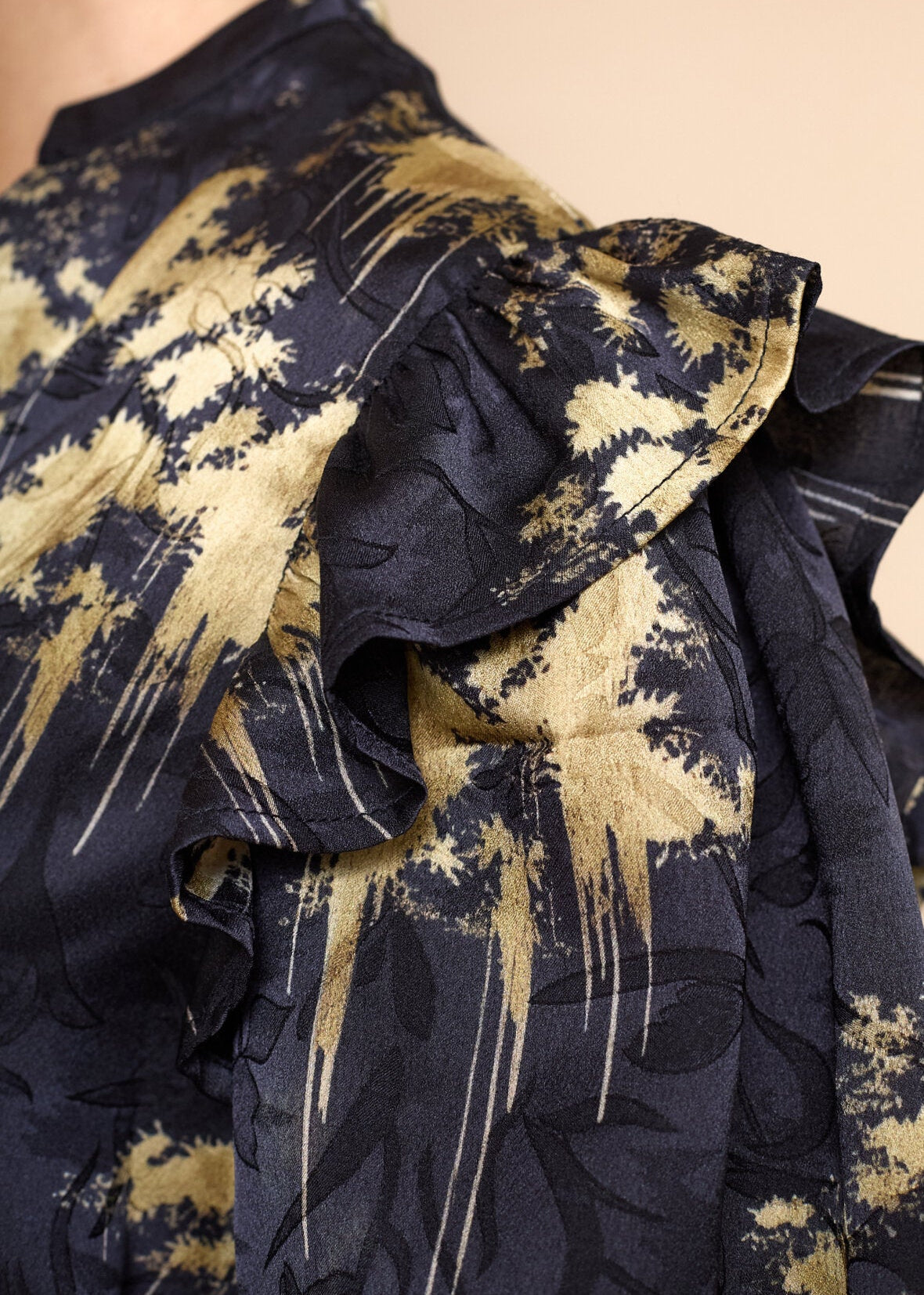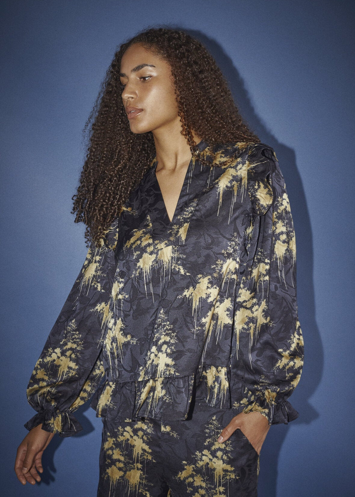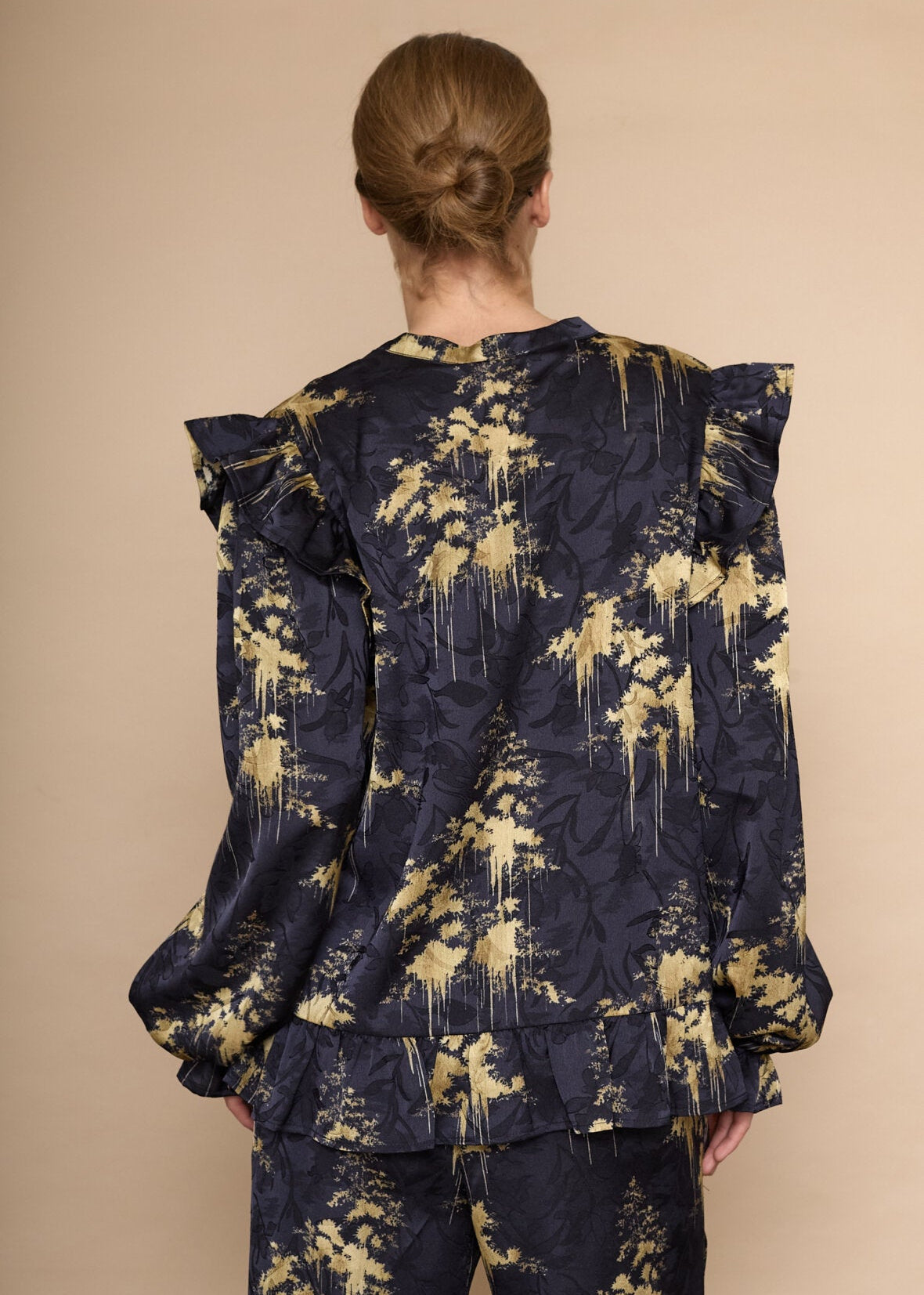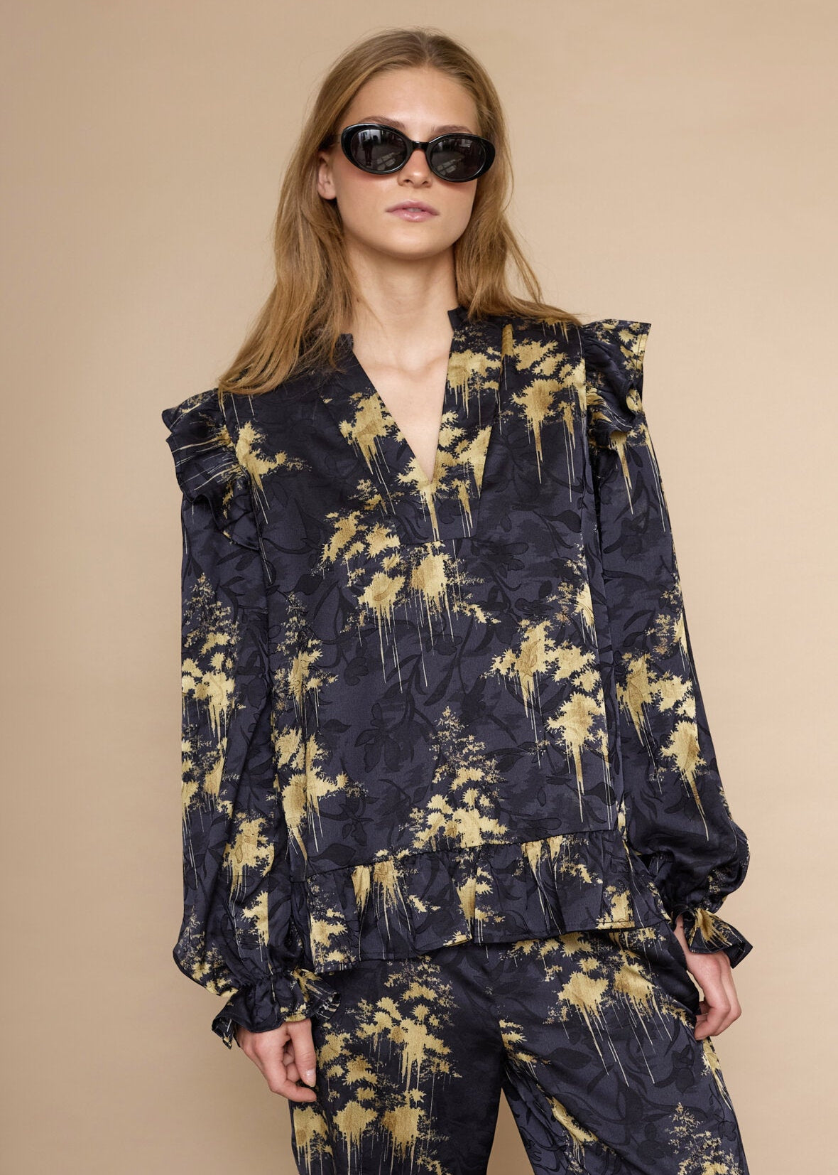 Skjorten har en V-halsudskæring, lange ærmer med flæsekanter ved manchetterne og en flæsekant forneden, der giver et feminint udtryk.