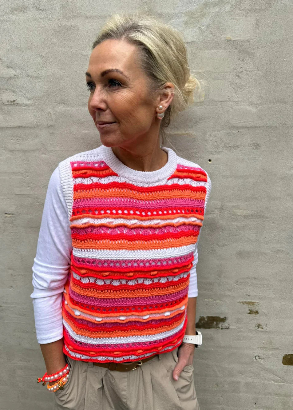 Milla Vest i orange, pink og hvid, fra Not Sisters er en farverig og iøjnefaldende strikvest, der tilfører masser af personlighed til dit outfit. De varme nuancer i striber skaber et livligt og moderne udtryk, som gør vesten til et statement piece i garderoben.