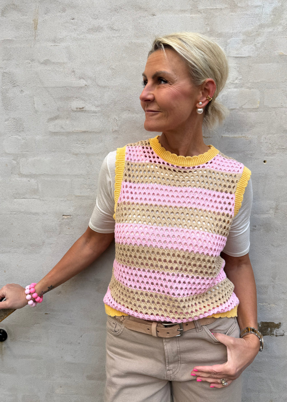 Vesten er designet i en let og luftig strikkvalitet med fine åbne detaljer, som giver et afslappet og sommerligt udtryk. De ribbede kanter i gul ved hals, ærmegab og bund tilfører en flot kontrast og understreger det unikke design.